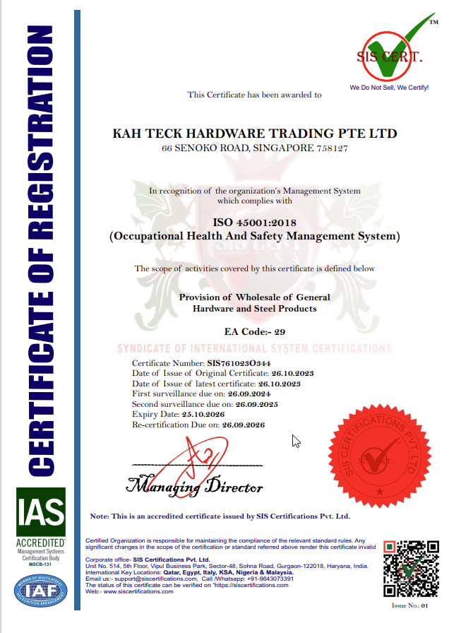 Today, we are part of the many contributions in the economic landscape and façade of Singapore where our steel and expertise are being constantly sought after. Our valuable experience in dealing with the diverse requirements of our customers in the construction and engineering industrial segment is a testament of our strong brand name in the marketplace. Our expertise and product quality in customized steel cutting of different complex forms and shapes is synonymous with our company’s name – Kah Teck Hardware Trading Pte Ltd. We are consistently reputed in this area of business excellence in the marketplace.